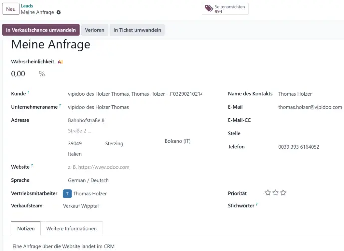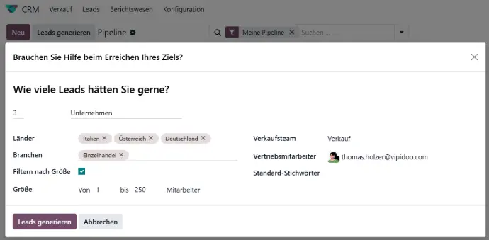 Ein besonderer Vorteil ist die Integration mit anderen Odoo-Modulen: So können beispielsweise ein Kontaktformular auf der Website oder ein Ticket im Helpdesk automatisch eine Verkaufschance generieren. Auf diese Weise entstehen durchgängige Prozesse – von der ersten Anfrage bis zur erfolgreichen Geschäftsabwicklung.
